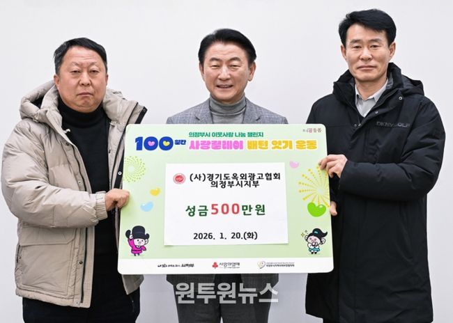 (원투원뉴스) 의정부시는 1월 20일 (사)경기도옥외광고협회 의정부시지부가 ‘100일간 사랑릴레이 배턴 잇기’에 동참해 성금 500만 원을 기탁했다고 밝혔다.