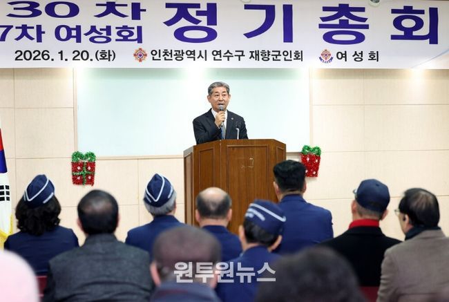 (원투원뉴스) 인천광역시의회 정해권 의장(국·연수구1)은 20일 인천시 연수구 보훈회관에서 열린 ‘2026년 제30차 연수구 재향군인회 및 제27차 연수구 재향군인회 여성회 정기총회’에 참석해 회원들을 격려했다.