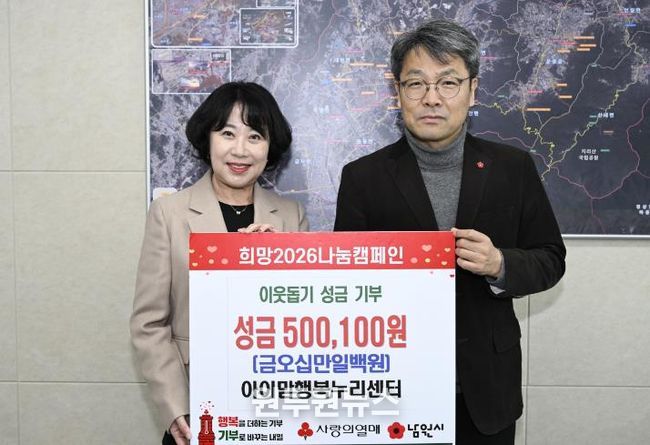 (원투원뉴스) 남원시는 지난 20일, 아이맘행복누리센터가 ‘희망 2026 나눔 캠페인’에 성금 50여만 원을 기부했다고 밝혔다.