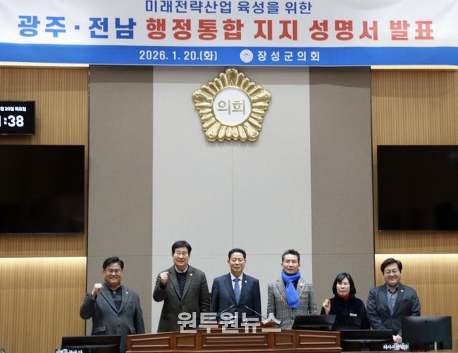 장성군의회는 성명서를 통해“행정통합은 국가균형발전을 위한 초광역 경제권 형성과 신산업 연계를 가능하게 하는 시대적 선택으로 재정규모 확대를 통한 실질적 자치권 강화를 위해 필요하다”며, “지방소멸과 수도권 일극체제 심화에 대응하기 위해 광주·전남 행정통합을 적극 지지한다”고 밝혔다.