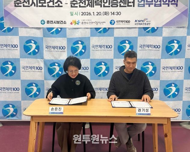 (원투원뉴스) 춘천시보건소와 춘천체력인증센터(센터장 권기성)가 20일 강원대 백령스포츠센터에서 춘천시민의 건강증진 활동과 체력수준 향상 및 상호 교류⬝협력 강화를 위한 업무협약을 체결했다.