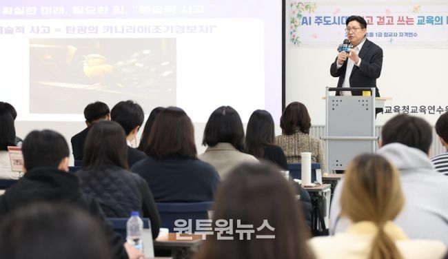 (원투원뉴스) 도성훈 인천광역시교육감은 20일 인천교육연수원에서 ‘초등 1급 정교사 자격연수’ 대상자 87명에게 ‘AI주도시대, 읽고, 걷고, 쓰는 교육의 미래’라는 주제로 강연을 진행했다.