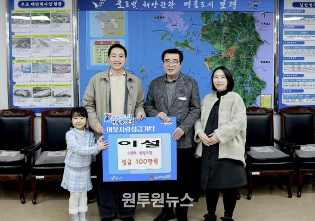 (원투원뉴스) 보령시는 지난 20일 시장실에서 이지원 씨와 배우자 고가슬 씨, 그리고 딸 이설 양이 참석한 가운데 ‘희망 나눔 캠페인’ 성금 전달식을 가졌다. 이날 이 씨 가족은 이설 양의 생일을 기념해 정성껏 마련한 성금 100만 원을 보령시에 기탁했다.