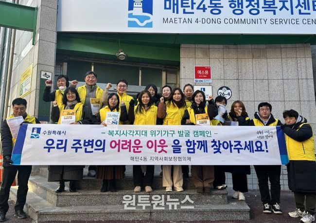 오미숙 매탄4동장은 “매탄4동 행정복지센터는 앞으로도 지속적인 위기가구 발굴 활동을 통해 동절기 복지 안전망 구축에 힘쓰겠다”며 “추운 날씨에도 캠페인에 적극 참여해 주신 지역사회보장협의체 위원님들께 감사드린다”고 밝혔다.