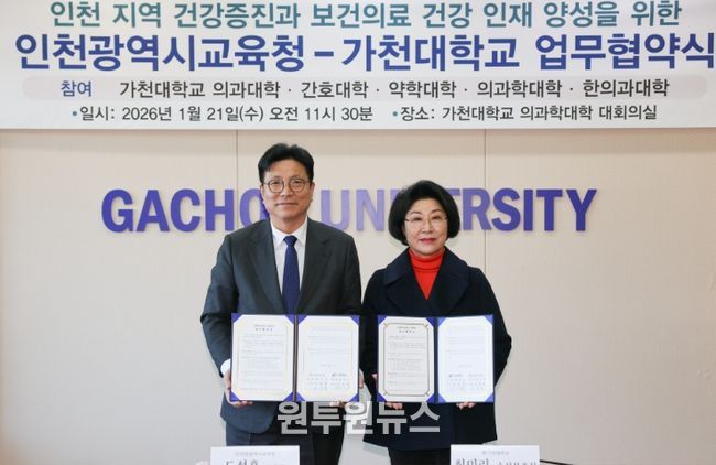 (원투원뉴스) 인천광역시교육청은 21일 가천대학교에서 ‘가천의료융합교육 및 연구협의체(G-MERCI)’와 보건·의료 분야 업무협약을 체결했다.