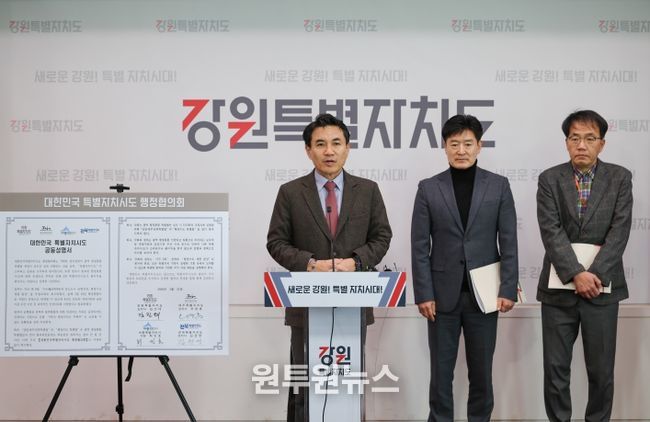 (원투원뉴스) 강원, 제주, 세종, 전북으로 구성된 ‘대한민국특별자치시도 행정협의회’(대표회장 : 김진태 강원특별자치도지사)는 1월 21일 4개 특별자치시‧도의 특별법안 조속한 통과와 광역 행정통합 인센티브 부여에 따른 역차별 우려를 담은 공동성명서를 발표했다.
