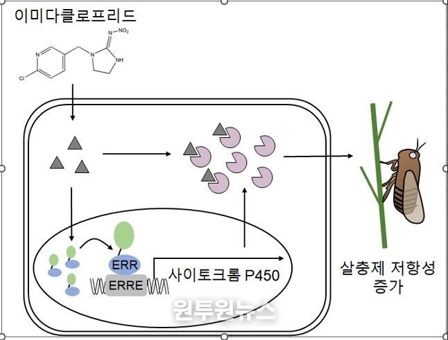 김돈규 교수 연구팀은 살충제 이미다클로프리드(imidacloprid)에 저항성을 보이는 벼멸구 집단에서 핵 호르몬 수용체인 ‘ERR(Estrogen-related receptor)’ 유전자의 발현이 현저히 증가한다는 점에 주목했다. 연구 결과, ERR 유전자가 살충제 해독 대사에 관여하는 사이토크롬 P450 효소 유전자(CYP4CE1, CYP6CW1)의 전사 조절 부위에 직접 결합해 이들 효소의 발현을 촉진한다는 사실을 규명했다.
