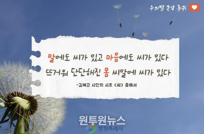 (원투원뉴스) 창원특례시는 각종 홍보 매체를 통해 소개할 우리말 공감 글귀 ‘봄편’ 문안을 23일부터 내달 4일까지 공개모집 한다.