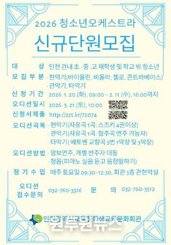 (원투원뉴스) 인천광역시교육청학생교육문화회관은 3월 21일 ‘2026학년도 청소년오케스트라 단원 모집 오디션’을 실시한다.