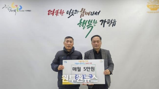 (원투원뉴스) 가평군 가평읍 주민 김성극 씨가 취약계층 이웃돕기 성금으로 매월 5만 원을 가평읍 행정복지센터에 정기기탁하기로 했다.