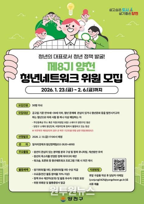 (원투원뉴스) 양천구는 청년이 직접 정책을 발굴하고 실행방안을 제안하는 청년 중심 소통 플랫폼 ‘제8기 양천 청년네트워크’ 위원을 2월 6일까지 모집한다고 밝혔다.