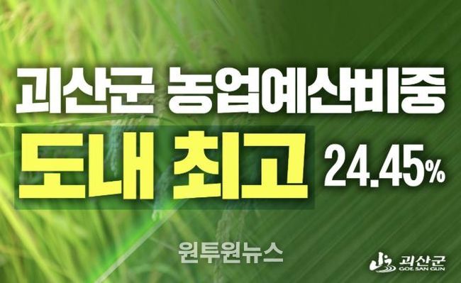 군이 23일 공개한 2026년 시·군별 예산 현황에 따르면 괴산군의 본예산 대비 농업 부문 예산 비율은 24.45%로 충북 11개 시·군 가운데 1위에 올랐다. 도 전체 평균(11.86%)과 비교해도 두 배를 훌쩍 넘는 지원이다.