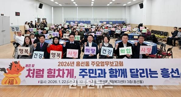 (원투원뉴스) 의정부시 흥선동행정복지센터는 1월 22일 행정복지센터 흥선홀에서 지역 주민과 내빈 등 150여 명이 참석한 가운데 2026년 주요업무보고회를 개최했다.