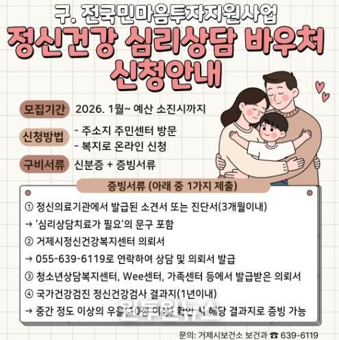 (원투원뉴스) 거제시는 2024년부터 시행해 온 '전국민 마음투자 지원사업'을 2026년부터 '정신건강 심리상담 바우처 사업'으로 명칭을 변경하여 지속 추진한다.