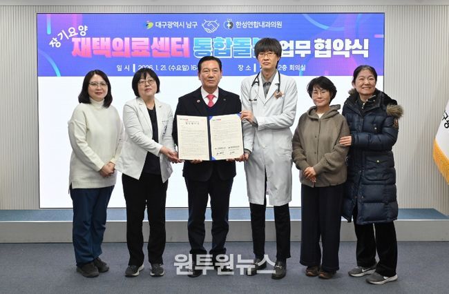 (원투원뉴스) 대구 남구는 지난 21일 장기요양 재택의료센터로 지정된 한성연합내과의원과 통합돌봄 업무협약을 체결하고, 재택의료센터 기반의 통합돌봄 서비스를 본격 추진한다. 이번 협약은 대구 남구에서 첫 재택의료센터로, 거동이 불편한 어르신이 ‘살던 곳에서’ 의료·요양·돌봄을 통합적으로 지원받을 수 있는 기반을 마련했다는 점에서 의미가 크다.
