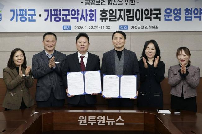가평군과 가평군약사회는 22일 가평군청에서 ‘휴일지킴이약국 운영 업무협약’을 체결하고 공공보건 향상을 위한 협력체계를 강화하기로 했다.