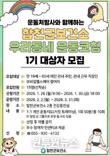 (원투원뉴스) 합천군은 개인별 체력과 건강 상태를 고려한 맞춤형 운동 프로그램 '우리 동네 운동코칭 : PT with U'에 참여할 1기 대상자를 모집한다고 23일 밝혔다.