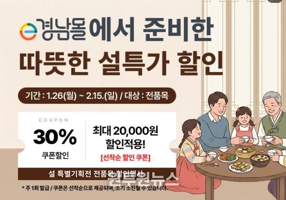 (원투원뉴스) 경상남도와 (재)경상남도투자경제진흥원이 운영하는 e경남몰은 1월 26일부터 예산 소진 시까지 ‘2026년 풍성한 설맞이 할인 기획전’을 진행한다.