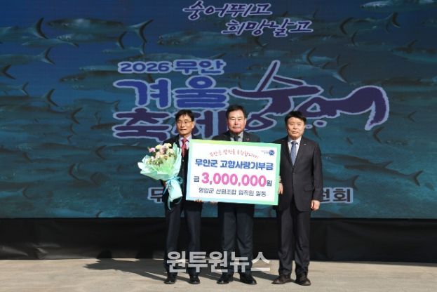 (원투원뉴스) 무안군은 지난 24일 열린 ‘2026 무안겨울숭어축제’를 계기로 영암군 산림조합 임직원들이 지역 간 상생 발전과 기부문화 확산을 위해 무안군 고향사랑기부금 300만 원을 기탁했다고 밝혔다.