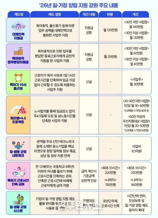 고용노동부는 최근 중소기업의 일‧가정 양립에 대한 지원을 집중적으로 확대해 나가고 있다. 출산휴가나 육아휴직 등으로 발생하는 인력 공백을 보완하기 위해 대체인력을 채용한 사업장에 지급하는 대체인력지원금은 현재 월 최대 120만원에서 올해부터는 30인 미만 사업장은 월 140만원, 30인 이상 사업장은 월 130만원으로 인상했다.