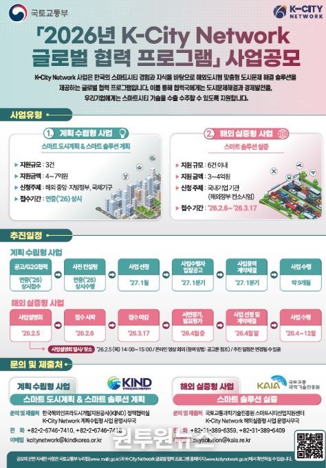 (원투원뉴스) 정부가 국내 스마트도시 기술의 해외 진출을 지원하기 위해 올해 'K-City 네트워크 글로벌 협력 사업' 공모를 추진한다. 이번 사업을 통해 기업들은 해외 도시에서 자사 기술을 직접 실증하고, 현지 여건에 맞는 사업 모델을 검증해 실제 수주와 사업화로 이어질 수 있는 기회를 얻게 된다.