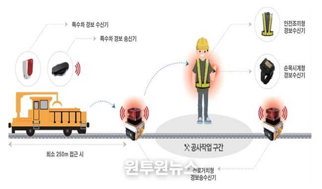 열차접근 경보장치는 특수차가 접근할 경우 작업자의 조끼·손목시계 등 4종 수신 알림장치로 즉시 경보음을 송출하는 방식으로 작동한다. 시·청각 기반 알림시스템 도입을 통해 작업자가 대피할 수 있는 ‘골든타임’을 확보할 수 있게 됐다.