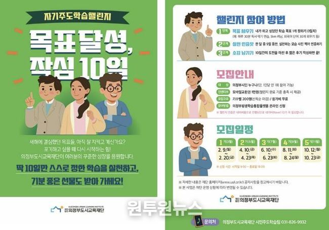 (원투원뉴스) 의정부도시교육재단은 의정부 시민대학 ‘도전실험실’의 핵심 프로그램으로 자기주도학습챌린지 ‘목표달성, 작심 10일’을 운영한다고 밝혔다.
