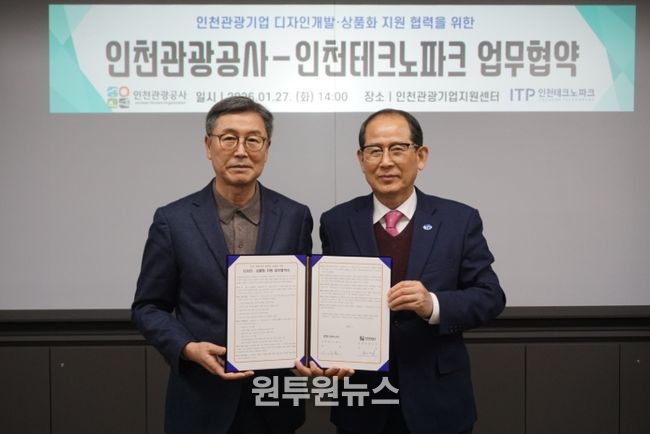 (원투원뉴스) 인천테크노파크(인천TP)는 인천관광공사와 지난 27일 지역 기업을 대상으로 관광기념품(굿즈) 개발을 지원하고, 이를 통해 지역 관광산업 경쟁력 강화를 도모하기 위한 업무협약(MOU)을 체결했다고 밝혔다.