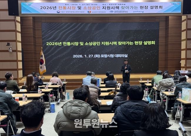 (원투원뉴스) 포항시는 27일 시청 대회의실에서 대구경북지방중소벤처기업청 주관으로 ‘2026년 전통시장·소상공인 찾아가는 현장설명회’를 개최하며 지역 상인들의 정책 접근성 강화에 나섰다.