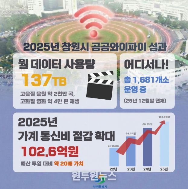 (원투원뉴스) 창원특례시가 시 전역 1,681개소에 설치·운영 중인 공공와이파이의 2025년 성과를 분석한 결과, 지난해보다 20.4억원이 증가한 102.6억원의 가계 통신비 절감을 이뤘다고 밝혔다.