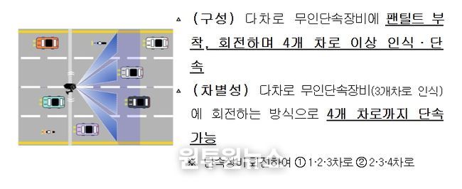 ‘다차로 단속장비’란 편도 3차로 이상의 도로에서 최소 3개 차로를 인식·단속하는 장비이며, 이 장비에 팬틸트(회전 카메라)를 부착하여 회전 기능을 활용하면 최대 4개 차로까지 단속할 수 있어 단속장비 1대 설치로 2대의 설치 효과를 낼 수 있다.