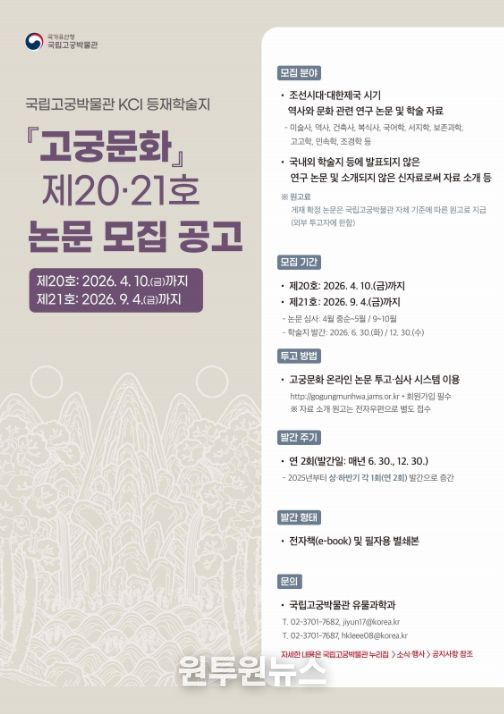 (원투원뉴스) 국가유산청 국립고궁박물관은 조선시대와 대한제국기의 역사·문화 연구를 활성화하기 위해 박물관에서 매년 발간하는 학술지 『고궁문화』 제20호와 제21호에 수록할 논문을 모집한다. 제20호는 올해 6월 30일, 제21호는 12월 30일 발간 예정이며, 논문 접수 마감일은 각각 4월 10일과 9월 4일이다.
