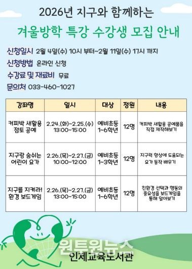(원투원뉴스) 인제교육도서관(관장 임채호)은 2월 24일부터 2월 27일까지 겨울방학 동안 초등학생 대상으로 환경 문제를 쉽고 흥미롭게 이해할 수 있는 기회를 마련하고자 겨울방학 특강을 운영한다.