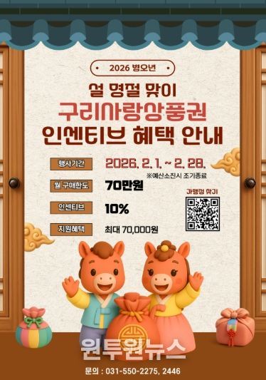 (원투원뉴스) 구리시는 설 명절을 맞아 지역 내 소비 촉진과 소상공인 매출 증대를 위해 2월 한 달간 구리사랑상품권 특별 인센티브를 10%로 확대 지원한다고 밝혔다. 이번 특별 인센티브는 1인당 월 구매 한도 70만 원까지 적용되며, 예산 소진 시 조기 종료될 수 있다.