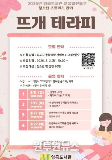 (원투원뉴스) 김포시 양곡도서관은 2026년 교육발전특구 사업의 일환으로 청소년 및 성인을 대상으로 한 스트레스 관리 프로그램 '뜨개 테라피'를 운영한다.