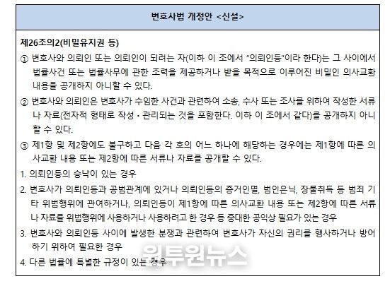 개정안은 ‘변호사와 의뢰인이 주고받은 법률상담 내용’이나, ‘변호사가 작성한 의견서’ 등을 비밀유지권으로 보호하고, ‘의뢰인이 공개에 동의한 경우’, ‘범죄와 관련되어 있는 경우’ 등 비밀유지권이 인정되지 않는 예외 사유를 규정하는 것을 주요 내용으로 한다.