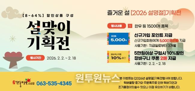 (원투원뉴스) 정읍시가 다가오는 설 명절을 맞아 지역 대표 농특산물 쇼핑몰인 ‘단풍미인쇼핑몰’에서 최대 64% 할인 혜택을 제공하는 특별 기획전을 마련했다.