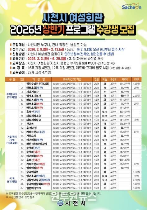 (원투원뉴스) 사천시 여성회관에서는 2026년 상반기 프로그램 수강생을 2월 9일부터 13일까지 사천시 여성회관 홈페이지를 통해 인터넷으로 선착순 모집한다.
