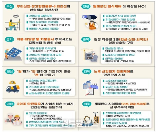 지방정부들은 안전관리자 선임이 어려운 작은 사업장들을 위한 공동안전관리자 지원, 어선작업현장‧농축산업 등 기존 지원사업들이 닿기 어려웠던 일터 지원, 뿌리산업‧조선업 등 지역의 사고다발 업종 집중지원, 외국인노동자 등 안전 취약계층에 대한 지원을 중심으로 특화사업을 기획했다.
