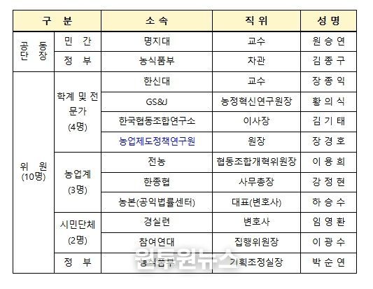 ‘농협 개혁 추진단’은 명지대 원승연 교수와 농식품부 김종구 차관이 공동단장을 맡는 민·관 합동 논의기구로, 농업계와 시민사회 분야, 협동조합·금융·법률 분야의 전문성을 갖춘 12명의 위원(단장 포함)으로 구성됐다.