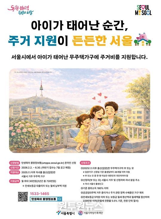 신청 자격은 자녀를 출산한 무주택가구 중 ▴기준 중위소득 180% 이하 ▴서울에 소재한 전세가 5억 원 이하 또는 월세(환산액) 229만 원 이하 임차 주택에 거주 등이며, 공공임대주택 입주자 및 서울시 임차보증금 이자 지원 등 정부·서울시 주거 지원 정책을 수혜 중인 가구는 제외된다. 기타 상세 자격요건은 2월 2일부터 서울시 및 ‘탄생육아 몽땅정보통’ 누리집의 공고문을 통해 확인 가능하다.