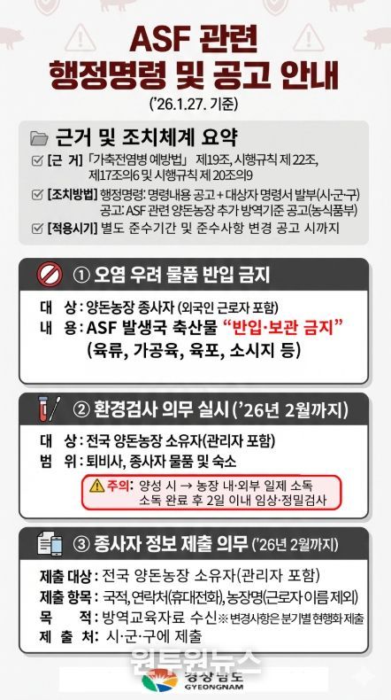 (원투원뉴스) 경상남도는 전남 영광 종돈장에서 아프리카돼지열병(ASF)이 발생하는 등 전국적으로 확산 우려가 커짐에 따라, 도내 모든 양돈농장과 축산시설을 대상으로 고강도 방역 대책을 추진한다고 밝혔다.
