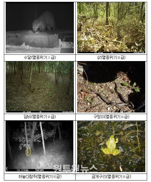 조사 결과, 확인된 멸종위기 야생생물 9종은 Ⅰ급 수달을 비롯해 Ⅱ급 8종(삵, 담비, 구렁이, 하늘다람쥐, 금개구리, 표범장지뱀, 참매, 새매)이다.