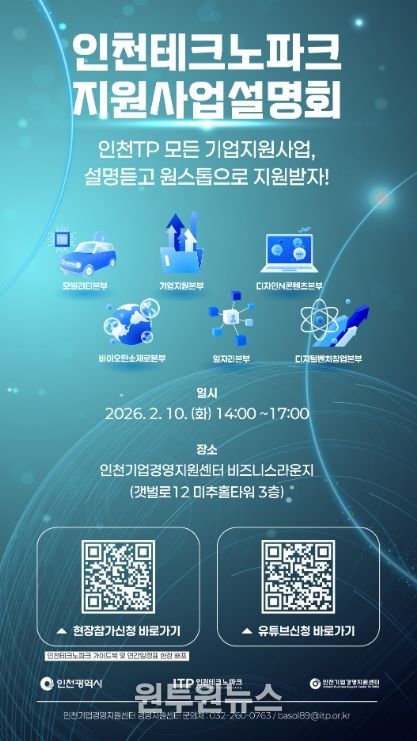 (원투원뉴스) 인천테크노파크(인천TP)는 오는 2월 10일 송도 미추홀타워에서 인천 지역 중소기업을 대상으로 ‘2026 인천테크노파크 지원사업 설명회’를 개최한다고 밝혔다.