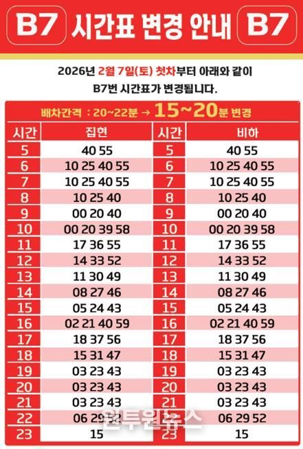 천흥빈 교통국장은 “B7번 노선은 세종과 청주를 잇는 핵심 광역교통 축으로, 시민 이용이 꾸준히 증가하고 있다”며 “이번 증차와 배차 단축을 통해 대중교통 이용 편의성을 높이고 광역 이동 수요에 적극 대응할 것”이라고 말했다.