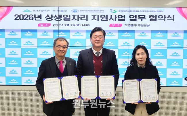 (원투원뉴스) 인천 미추홀구는 2일 구청장실에서 인하공업전문대학(총장 김성찬)과 인천미추홀여성인력개발센터(관장 심혜미)와 ‘2026년 상생 일자리 지원 사업’ 추진을 위한 업무협약을 체결했다.