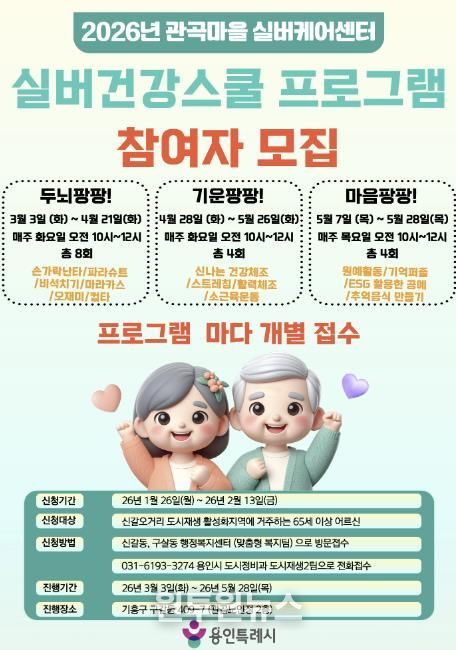 (원투원뉴스) 용인특례시는 ‘관곡마을 실버케어센터 실버건강 프로그램’ 참가자를 13일까지 모집한다.