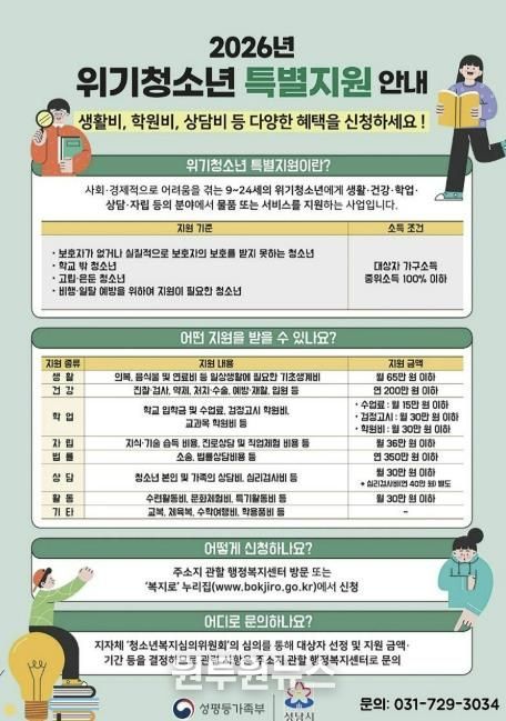 (원투원뉴스) 성남시는 위기 청소년의 생활, 학업 등을 돕기 위한 특별지원 사업을 시행한다고 3일 밝혔다.