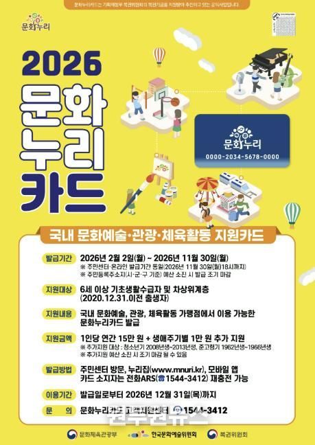 시 관계자는 “문화누리카드 예산 소진 시 문화누리카드 발급이 어려우므로 빠른 신청을 권장한다”며 “문화누리카드 지원 금액이 올해 1만 원 증액된 만큼 적극적으로 사용해 문화향유의 기회를 누리길 바란다”고 말했다.