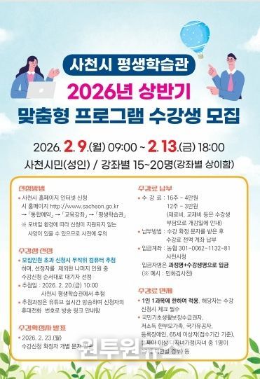 (원투원뉴스) 사천시 평생학습관이 2026년 상반기 맞춤형 프로그램 수강생을 2월 9일부터 13일까지 모집한다고 3일 밝혔다.